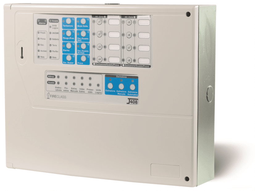 Πίνακας συμβατικής πυρανίχνευσης 8 ζωνών με ενσωματωμένη πλακέτα κατάσβεσης, σχεδιασμένος σύμφωνα με τα standards προδιαγραφών EN54 & ΕΝ12094-1. Δέχεται 2 μπαταρίες 12V 7Ah.