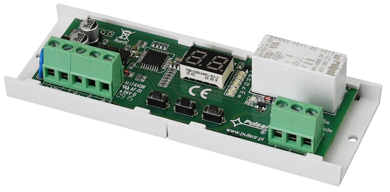 Module χρονικού ρελέ NO και NC. Διαθέτει 18 διαφορετικά προγράμματα για ρύθμιση χρονικού από 1sec έως 99hr 59min 59sec. Τροφοδοσία 12V DC και διέγερση με +12V ή 0V (GND). Διαθέτει επίσης τερματικό R(-) το οποίο μπορεί να χρησιμοποιηθεί για επαναφορά του χρονικού (reset) σε ορισμένα από τα προγράμματα.