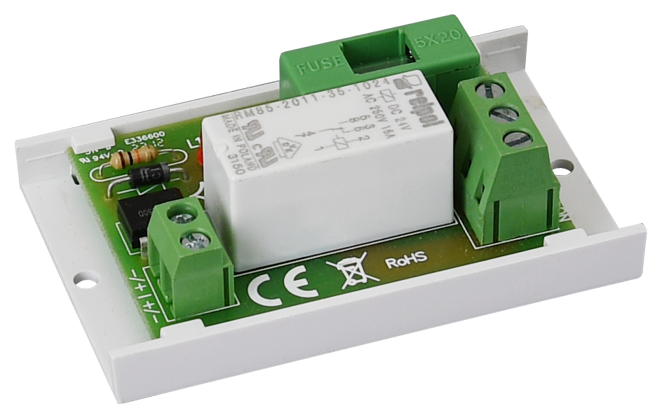 Πλακέτα ρελέ ισχύος τάσης διέγερσης 20-32VDC σε πλαστική βάση με ταινία διπλής όψεως, ενδεικτικό LED λειτουργίας και ασφάλεια.